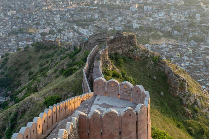 From the top of the Aravalli hills, Nahargarh Fort has a great view of Jaipur. It was built in 1734 so that the royal family could have a safe place to stay. People know it for its long walls and lovely rooms inside.
