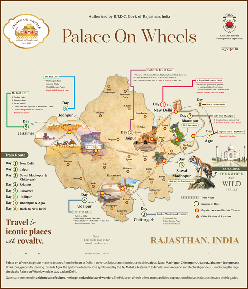 The Palace on Wheels Train Route for the whole trip will show you every detail of your ongoing trip. This trip will be worth remembering because it combines history, culture, and beautiful scenery.
